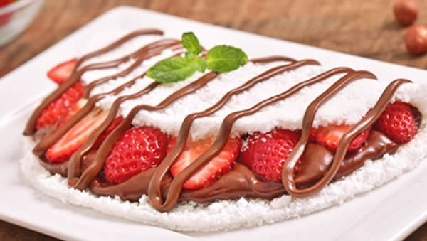 Quem não estiver preocupado com dieta, essa opção de tapioca recheada é uma bomba de sabor! Para esta tapioca, você pode adicionar Nutella a gosto, mas tenha cautela. Em seguida, adicione de 5 a 6 morangos ao chocolate. Pronto! Pode saborear essa maravilha!
