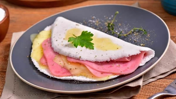Simples e deliciosa! Essa tapioca precisa apenas de 2 fatias de queijo prato (ou muçarela) e 2 fatias de presunto. Deixe esquentar até que o queijo derreta. Em seguida, adicione uma pitadinha de orégano e se delicie!